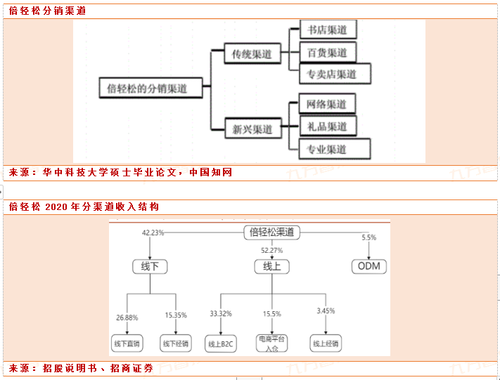 小结:倍轻松主要生产按摩小电器,产品SKU并不少,但是公司依靠优秀的设计和产品性能采取“高举高打”的打法,产品定位高端,渠道总体呈现以下特点。
