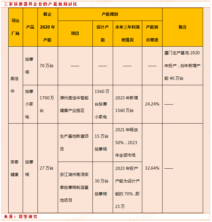 本文通过研究按摩企业的渠道、经销商政策以及产能规划等等方面,从而可以帮助我们了解按摩器具行业相关公司的核心竞争力。荣泰健康整体更为聚集,专注按摩椅和一线城市市场,渠道密度高;线上线下约45:55结构合理。奥佳华则全球化布局,品牌矩阵丰富。倍轻松专注按摩小电器产品定位高端设计感强,依靠强产品力配合均衡的各类渠道增长增速较快。