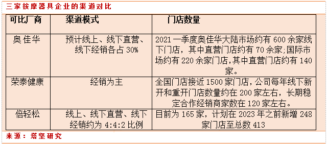 (1)渠道数量上对比,荣泰健康1500家,奥佳华1200家,荣泰健康较多。