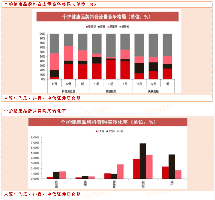 新渠道的扩展,带来行业格局的洗牌。抖音作为线上增长最快的直播渠道,核心通过流量与转化看品牌扩张潜力。具体来看,按摩仪器赛道仍处于渠道扩展的初期,飞利浦、SKG等品牌虹吸了局部按摩仪器赛道的大部分GMV,大型按摩椅则竞争环境较优,奥佳华、荣泰、摩摩哒等品牌稳步发展,商品游览购买转换率稳步提升,未来品牌空间广阔。