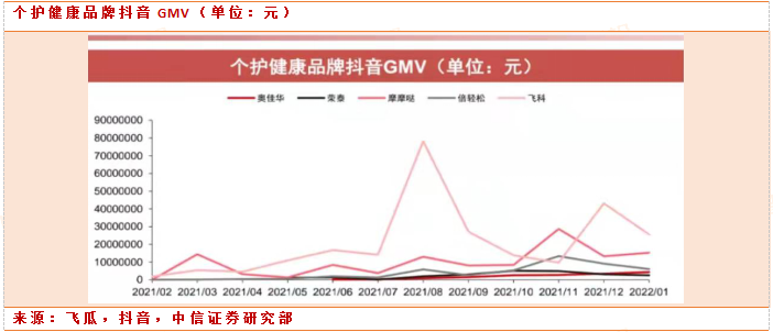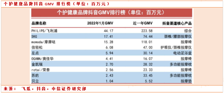 按摩椅品牌流量效率稳步提升,小型按摩器仪竞争激烈。根据相关数据标明,在按摩类器具的上市公司中,荣泰健康旗下品牌摩摩哒的1月GMV和近一年的在抖音中GMV的排名较高,紧接的排名是倍轻松、奥佳华和荣泰。荣泰健康的产品的直播效果和在抖音的用户粘度较高。