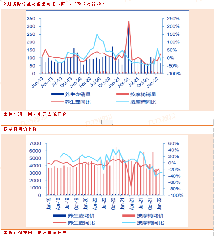 按摩椅均价和销量呈下降态势。根据淘宝网月度数据,2022 年 2 月按摩椅实现线上销量 6.48 万台,同比下 降 14.97%;价格方面,整体线上市场均价同比下降 29.87%至 3179 元。主要因为经济整体低迷,疫情侵扰下消费者情绪悲观,对于按摩椅这类可选消费品会首先收到压制,而经济奇暖向上此类消费才会出现需求上的复苏。