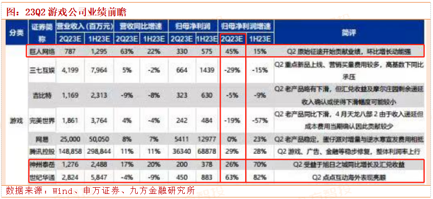 从游戏公司Q2业绩前瞻来看,Q2净利润增速居前的公司包括世纪华通、巨人网络、神州泰岳等。