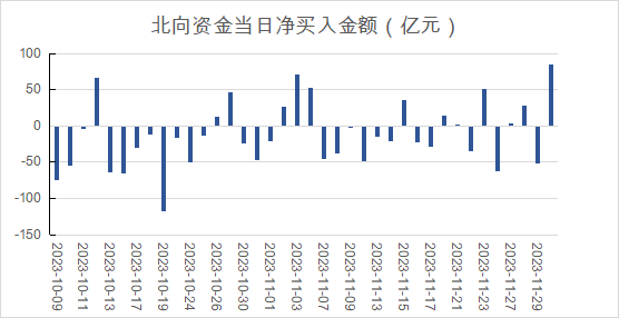 11月30日,北向资金转为净流入,陆股通整日净流入规模为85.16亿元。其中,沪股通整日净流入63.77亿元,深股通整日净流入21.39亿元。