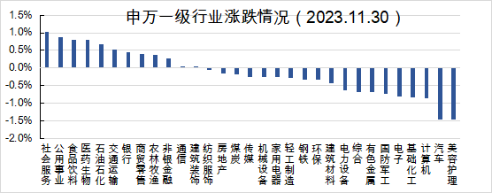11月30日A股各行业涨跌互现,社会服务、公用事业、食品饮料、医药生物等消费行业涨幅靠前,但美容护理、汽车、计算机等行业跌幅相对较大。