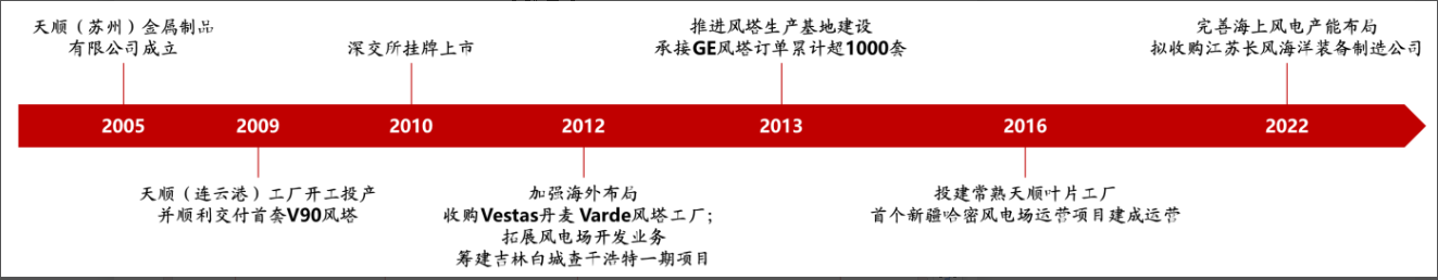 天顺风能前身天顺(苏州)金属制品有限公司于2005年成立,2009年在连云港工厂开工投产并交付首套V90风塔产品,并于2010年在深交所上市。