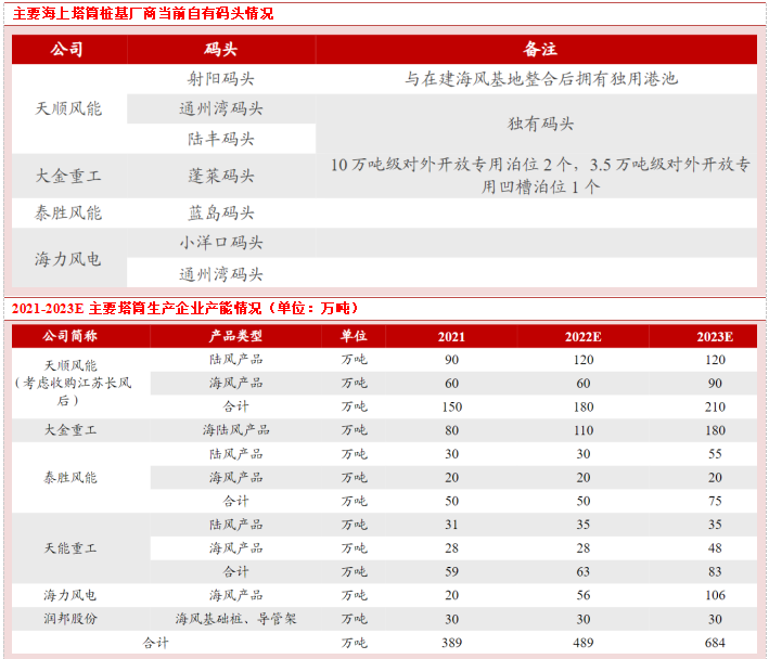 根据海力风电招股说明书,通过自有码头运输单台桩基运费为14.95万元/套,其他地区运输单台桩基运费为42.17万元/套,自有码头能够显著降低公司海运成本。天顺风能在建射阳基地设有独用港池,通州湾、陆丰两大基地拥有独有码头;大金重工蓬莱基地拥有10万吨级专用泊位2个,3.5万吨级对外开放泊位1个;泰胜风能以蓝岛码头为主要运输码头,海力风电拥有小洋口、通州湾两个码头,并积极在山东、海南等地持续布局。