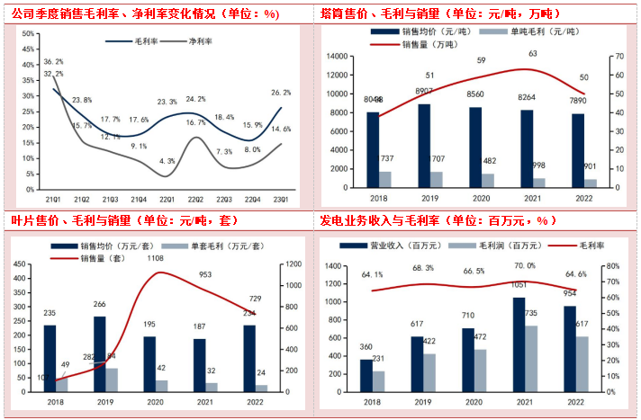 2022年上半年公司叶片业务受产能利用率较低、玻纤树脂价格仍处于高位影响,毛利率较低,下半年随着原材料价格大幅下降和公司出货量的环比提升,毛利率显著复苏。2022年下半年以来,包括中厚板、玻纤、树脂在内的主要原材料价格出现大幅回调,2023年制造业务毛利率有望同比提升。