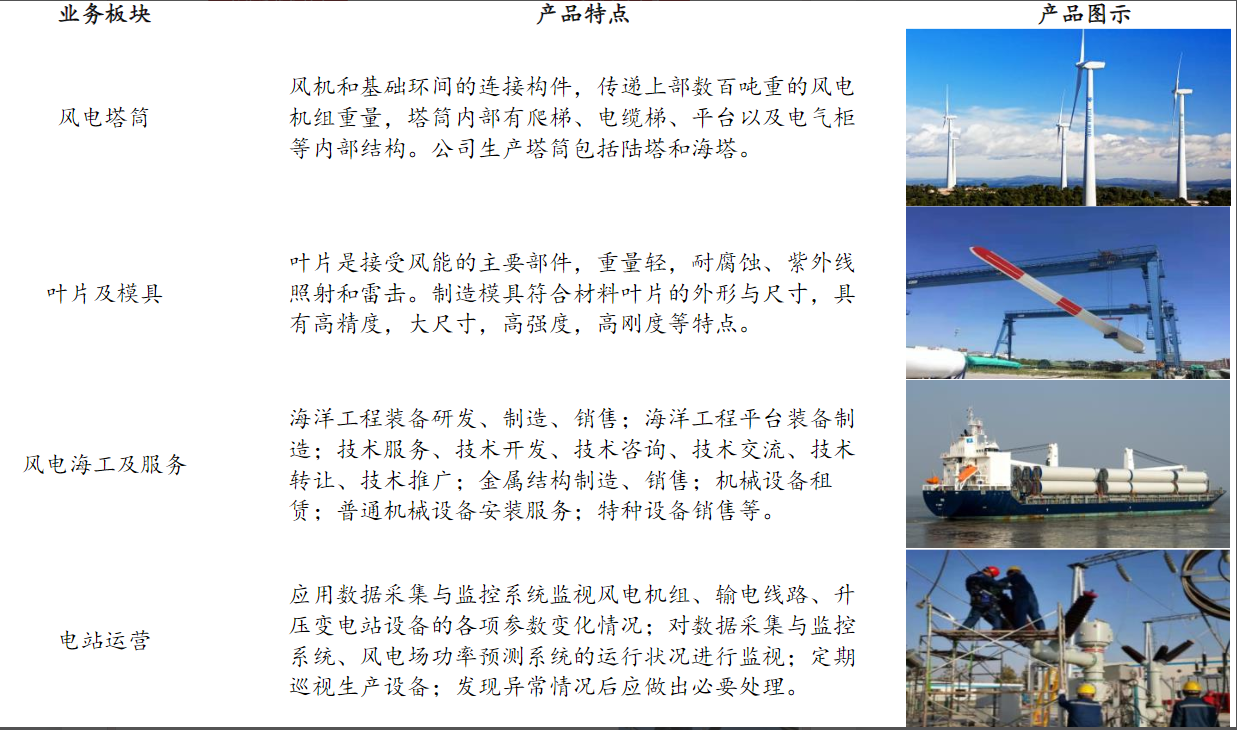 自成立起始终深耕风电领域,主产品包括风电塔筒、叶片等;近年以风电海工业务为未来发展的新锚点,凭借风电装备制造领域的竞争优势,开启新的海工布局。