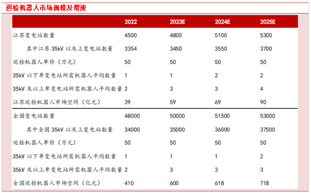 全国范围来看,2022年约有变电站48000个,其中35kV及以上变电站约34000万个。以江苏等量的机器人配备比例进行计算,22年全国巡检机器人市场空间可达410亿元。鉴于江苏为我国电网大省,至25年巡检机器人配备比例可能将优于全国均值。假设全国35kV以下/35kV及以上变电站分别配备2/3个巡检机器人,则25年全国巡检机器人市场空间可达718亿元,22-25年CAGR有望达20.53%。