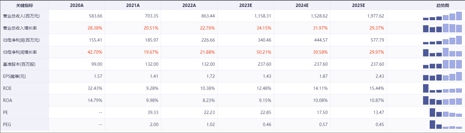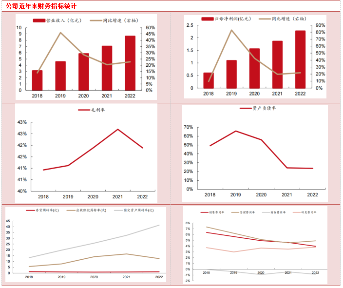 2018-2022年公司营业收入分别为3.11/4.55/5.84/7.03/8.63亿元,同比13.90%/46.10%/28.38%/20.51%/22.76%,近年来营业收入增速逐年提升。2018-2022年公司归母净利润分别为0.60/1.09/1.55/1.86/2.27亿元,同比9.47%/83.01%/42.70%/19.67%/21.88%。