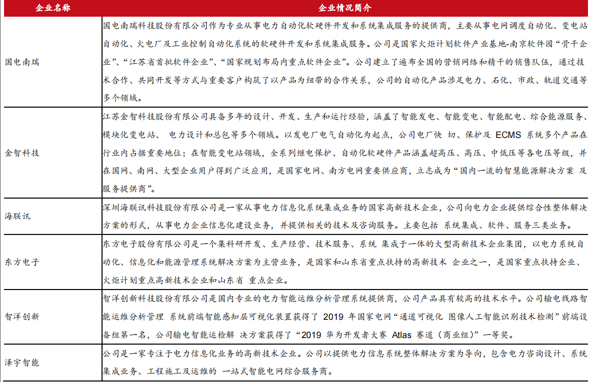 电力信息化领域专业化程度高,行业竞争格局市场化。目前,我国的电力信息市场经过不断发展,业内公司已经在各自领域形成了竞争优势,暂无垄断企业出现。国电南瑞是目前行业龙头企业,背靠国家电网,在订单获取上拥有优势并且在网络集成和应用集成深耕多年,技术积累深厚,金智科技、东方电子和智洋创新以应用集成为主,业务遍布电网各个环节的智能化,海联讯和泽宇智能以网络集成为主,主要为构建通信信息系统。