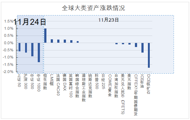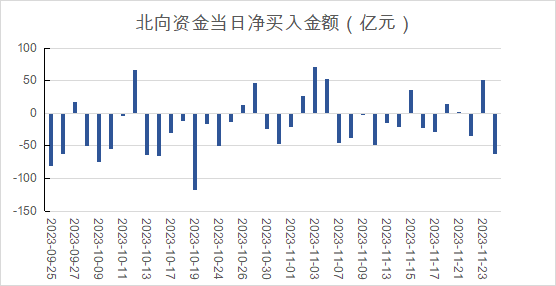 11月24日,尽管昨日指数触底回升,但本日市场并没有延续此前的反弹趋势,北向资金也再度转为净流出,上证指数整日下跌0.68%,中证500、中证1000等中小盘指数跌幅相对更大。