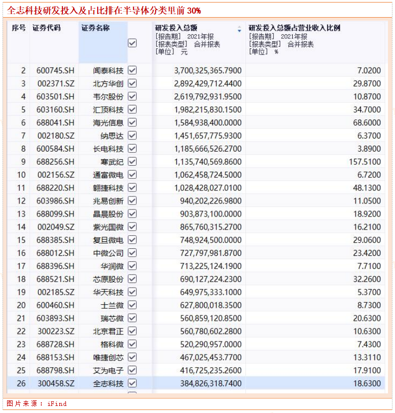 在筛选半导体个股时,我们依然首先看其研发投入总额与研发投入占比情况,以确保公司在创新力和核心竞争力上处于比较好的地位。根据iFind数据,2021年全志科技研发投入总额为3.85亿元,位于申万半导体分类里第26位;占营收比例达到18.63%,位于第30位。申万半导体共125只个股,全志科技研发投入及占比大致排在前20%-30%左右。