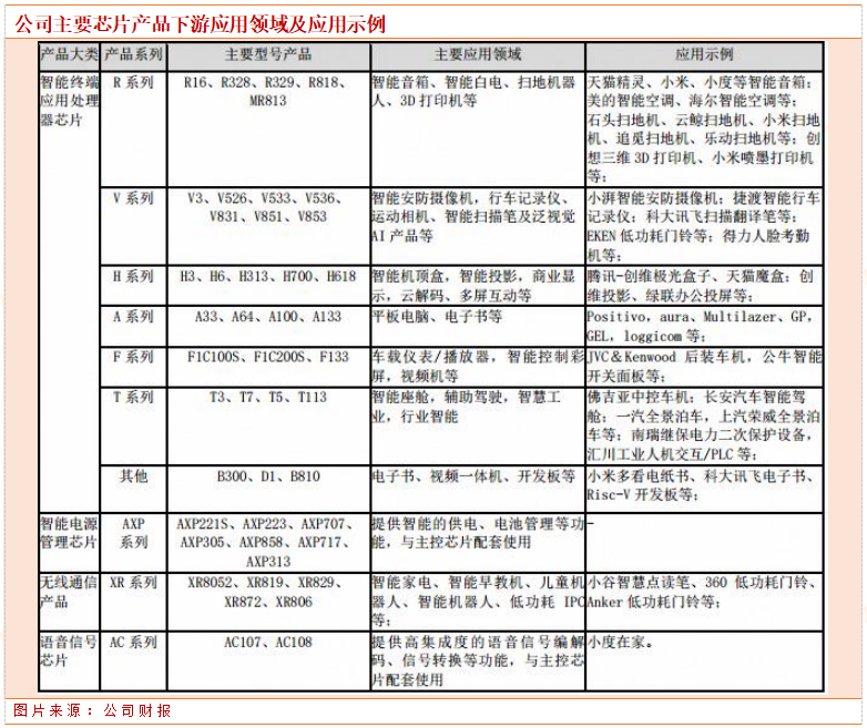 产品广泛适用于智能硬件、平板电脑、智能家电、车联网、扫地机器人、虚拟现实、网络机顶盒以及电源模拟器件、无线通信模组、智能物联网等多个产品领域。目前公司产品系列包括:安卓平板电脑产品线A系列、多媒体处理器解码应用F系列、OTT家庭娱乐H系列、智能语音交互等智能硬件R系列、智能车载处理器T系列、专业视像应用V系列、无人机/扫地机/VR解决方案X系列。