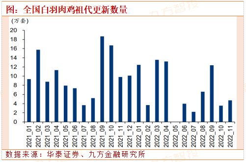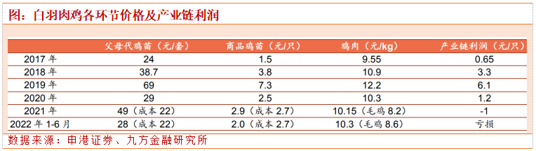 商品代毛鸡出栏量是价格的直接决定因素。当前,父母代后备存栏仍处于高位。2022年5月祖代引种量开始下降,意味着父母代后备存栏将于2022年12月-2023年2月开始下降,则在产父母代存栏将于2023年6-8月下降,商品代肉鸡出栏量将于2023年8-10月开始下行。