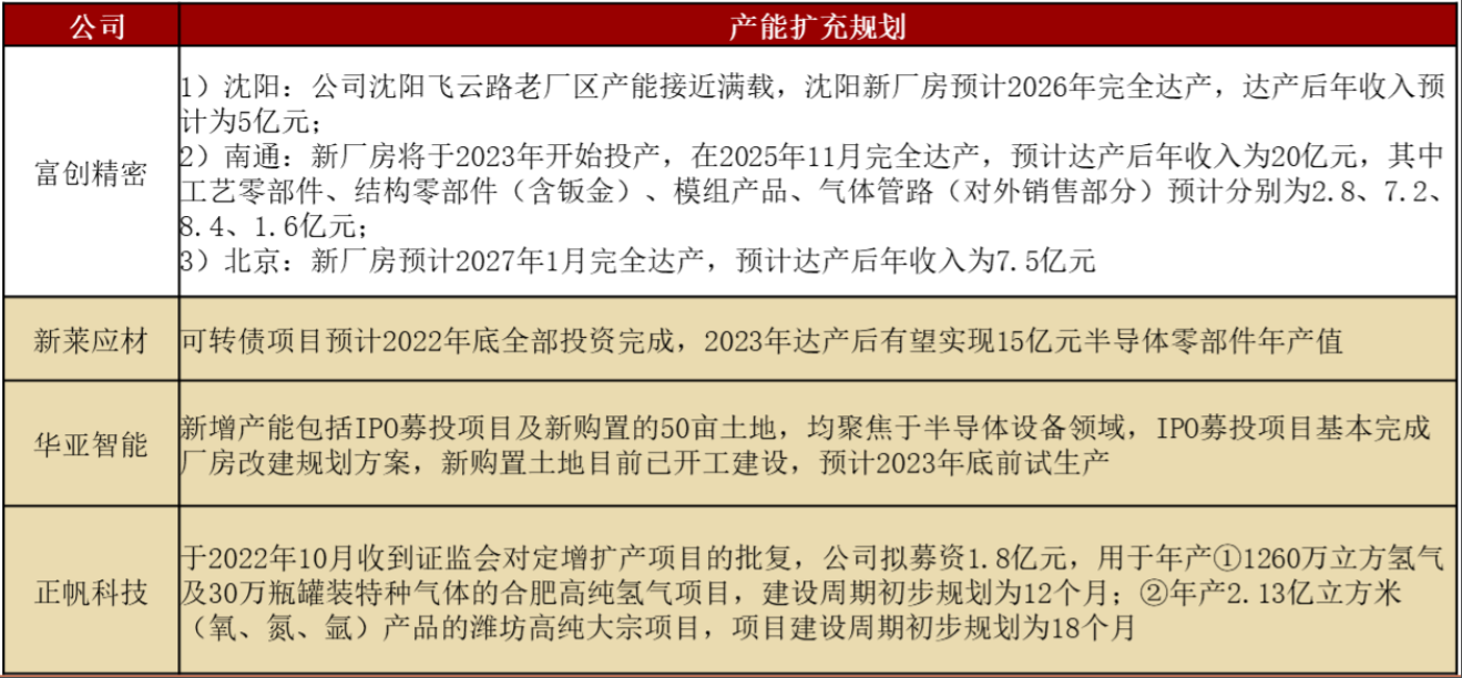 国内部分半导体设备零部件厂商产能扩充规划:国内零部件公司如富创精密等在海外大客户的订单存在一定积压,可能在2023年确认收入,因此海外业务收入预计保持稳健增长。