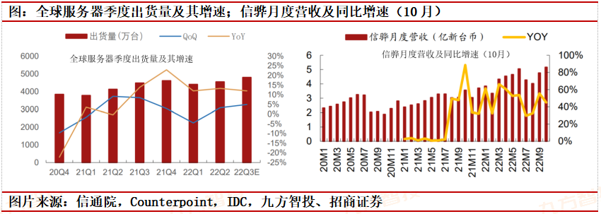 服务器:缺芯逐步缓解,全球服务器季度出货量预计22Q3环比正增长。服务器指标股信骅(全球服务器BMC芯片龙头)2022年10月营收同比+45.1%/环比+8.4%。