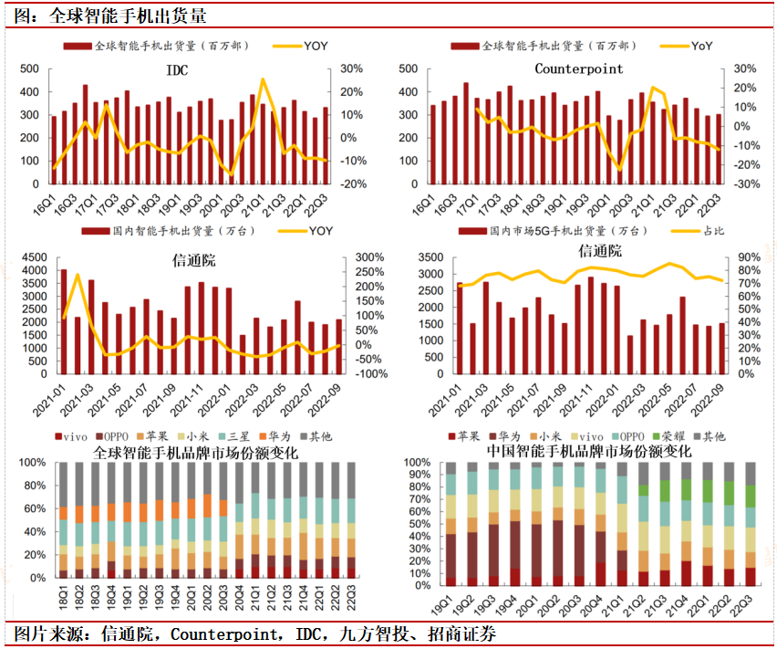 智能手机:Q3旺季不旺,Q4行业库存仍待消化需求疲软。IDC预计全球智能手机市场出货量3.01亿部,同比-9.7%/环比+5.5%,较此前预测下降2%以上。信通院:7/8/9月国内市场手机出货量分别同比-30%/-22%/-2%。“双十一”销量同比下滑,Q4需求未见恢复。