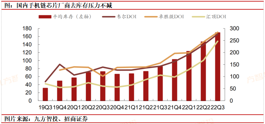 国内手机链芯片厂商去库存压力不减:韦尔股份、卓胜微和汇顶科技三家公司的库存水平从21Q1开始至今逐季提升,整体库存水位不断创造季度历史新高,库存周转天数也远超近三年平均水平,22Q3韦尔股份、卓胜微和汇顶科技的库存周转天数已经分别达到277、284、247天,远超全球手机链芯片大厂113天的平均水平。