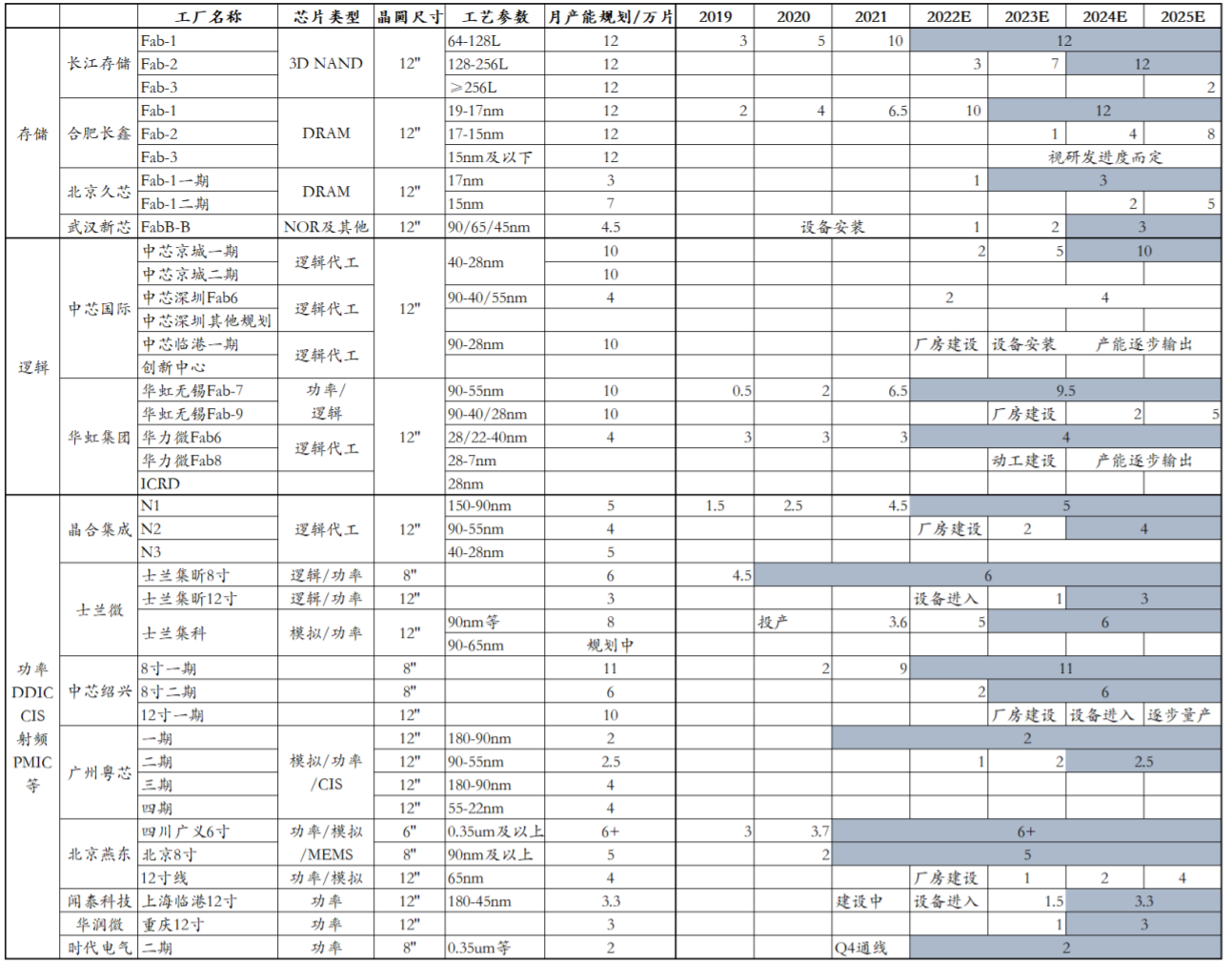 图:国内晶圆产线扩产节奏汇总(备注:长江存储、长鑫存储2022-2025年扩产进度或有延迟可能性)