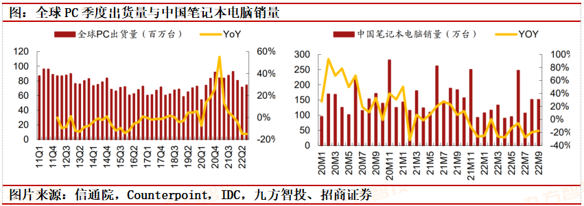 PC:22Q3全球PC出货量同比-15%,同比跌幅扩大,苹果逆势攀升,Q3出货1006万台,同比+40%。IDC预计2022年全球PC的出货量将下跌12.8%至3.05亿台。