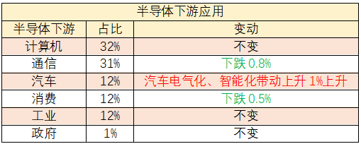 汽车电气化、智能化带动汽车领域上升1%。据SIA数据,2021年全球半导体市场总额为5560亿美元,绝大多数半导体需求是由消费者最终购买的产品驱动。