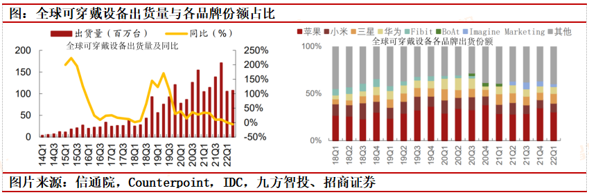 可穿戴:受疫情、通胀、俄乌战争等因素影响,可穿戴市场需求疲软。可穿戴市场需求受宏观经济影响较大,根据IDC数据,22Q2全球可穿戴设备出货量1.07亿台,同比-6%。