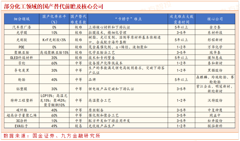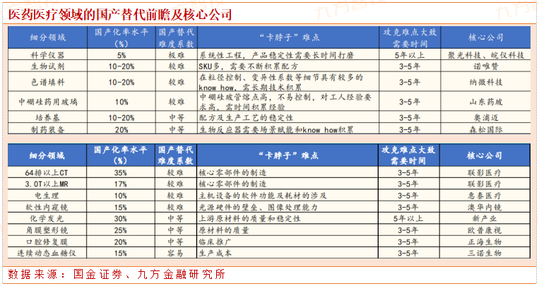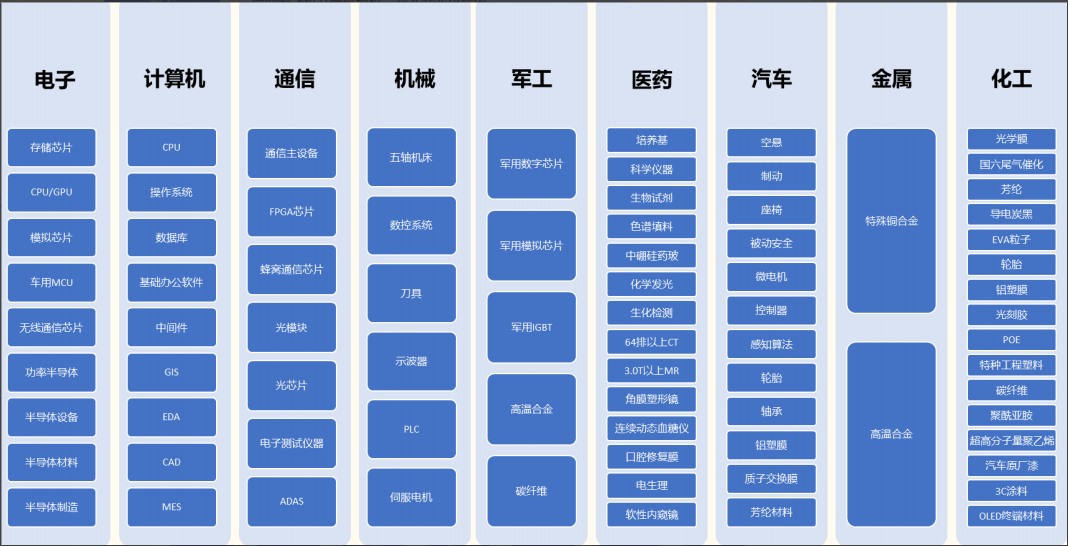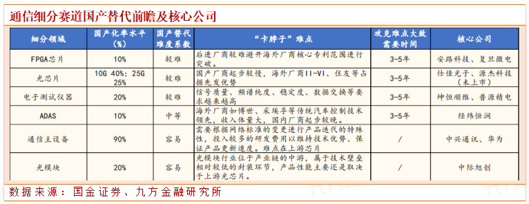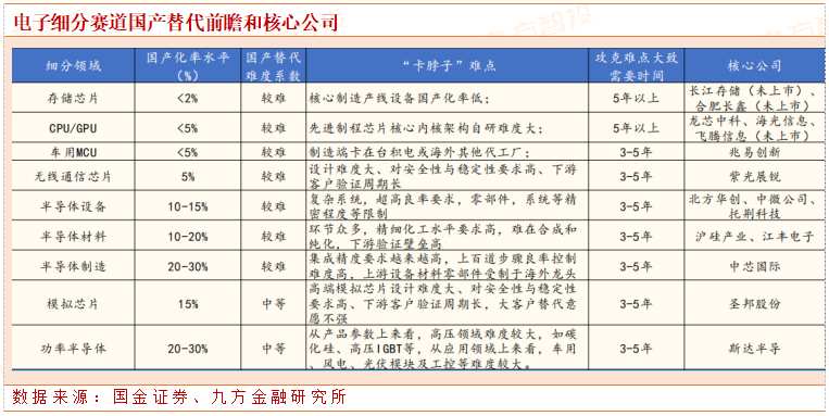 自下而上的看,从“当前国产化率、国产替代难度、卡脖子难点、攻克难点时间”四个维度可以有效反映细分行业的现状、难点及前景,并筛选出各细分行业的龙头企业及二三线公司。