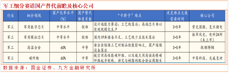 军工一直是自主可控的部门,在少数上游芯片、上游材料(例如碳纤维、高温合金)方面有待提升,在航发方面与海外差距也正在努力追赶中。这类细分的投资机会,更多的与半导体等科技股类似,要看技术突破节点。