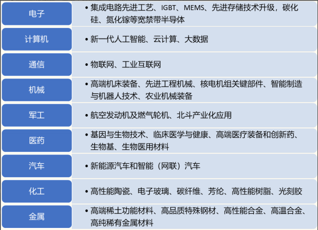 自上而下的看,“十四五”规划对后续几年的重大方向都进行了系统的梳理,特别是其中各大重要领域的专栏,对细分产业和领域都做出了具体的阐述。从“科学前沿领域攻关”、“国家重大科技基础设施”、“制造业核心竞争力提升”、“数字经济重点产业”四大专栏来看,科技领域的电子、通信、计算机,制造领域的机械、军工和汽车以及医药行业在自主可控和安全高效方面需要重点关注。
