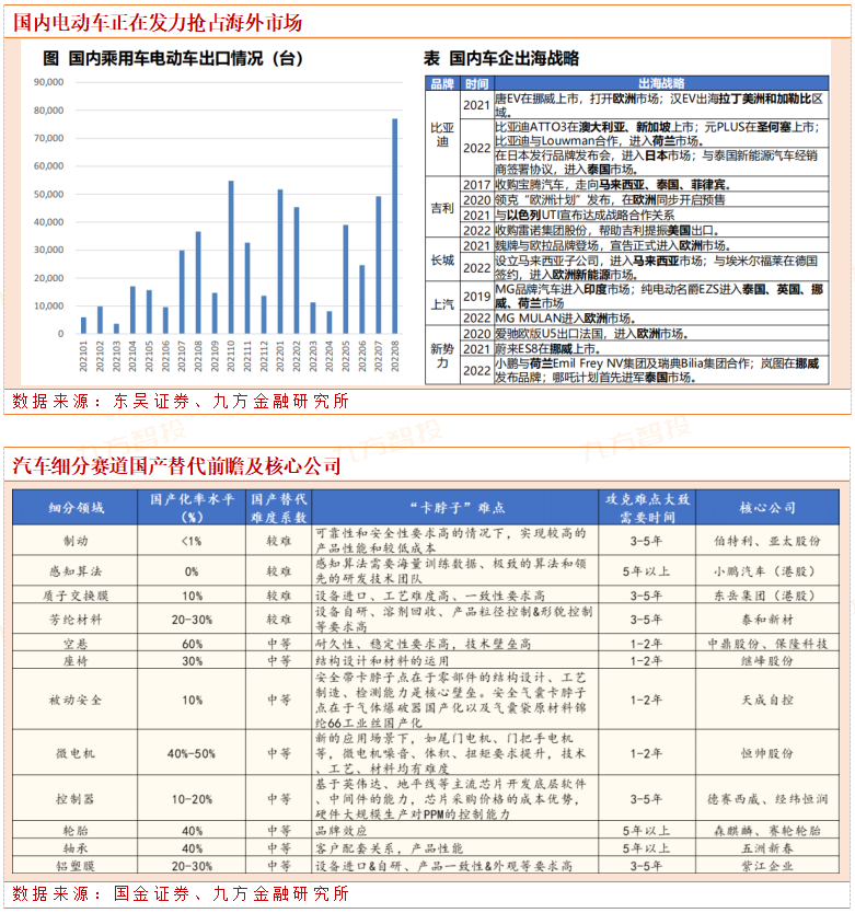 过去汽车市场主要由德系、日系、美系主导,零部件产业链也多为海外公司;在国内市场通过合资引进后,构建了较为完整的供应链体系,扶持了一大批零部件公司。进入电车时代后,国内弯道超车的优势已在近两年明显体现了出来,不但整车在国内销售火爆,今年出口量也大增,开始抢占欧美市场。