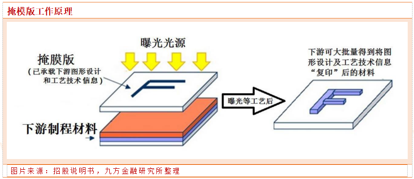 掩膜版对下游行业生产线的作用主要体现为利用掩膜版上已设计好的图案,通过透光与非透光的方式进行图像(电路图形)复制,从而实现批量生产。