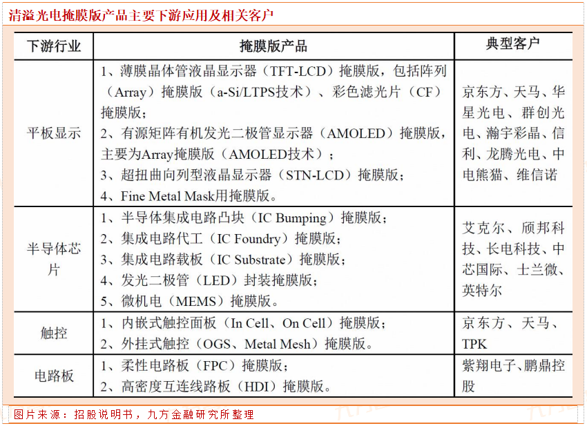 公司平板显示行业用掩膜版包括薄膜晶体管液晶显示器(TFT-LCD)掩膜版含阵列(Array)掩膜版(a-Si/LTPS技术)及彩色滤光片(CF)掩膜版、有源矩阵有机发光二极管显示器(AMOLED)掩膜版、超扭曲向列型液晶显示器(STN-LCD)掩膜版和FineMetalMask用掩膜版、MicroLED显示用掩膜版和硅基半导体显示用掩膜版等。服务的典型客户包括京东方、惠科、天马、华星光电、群创光电、瀚宇彩晶、信利、龙腾光电、维信诺等客户。