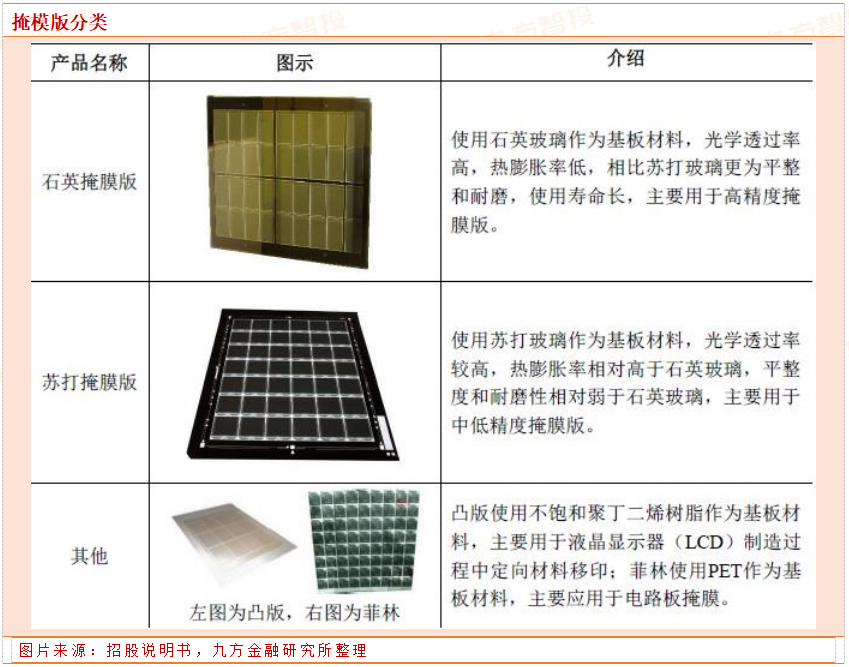 掩膜版产品根据基板材质的不同主要可分为石英掩膜版、苏打掩膜版和其他(包含凸版、菲林)。