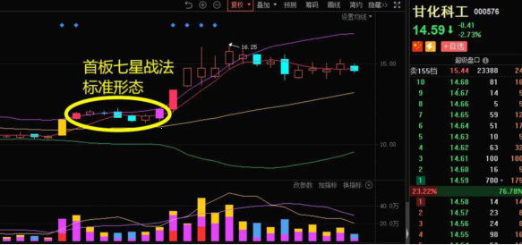 案例二:甘化科工首板之后爆出收购事宜,随后7天横盘震荡,保持趋势向上,量能活跃,最终顺利向上突破,属于标准的首板七星战法。