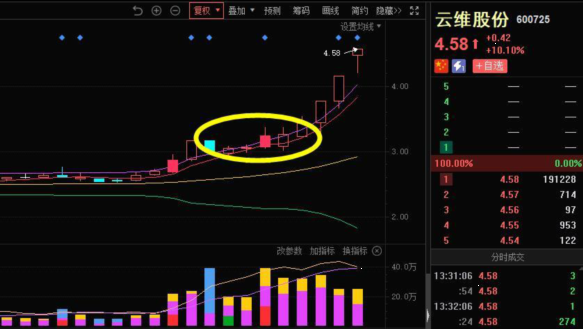 案例三:云维股份该股首板位于半年报披露后不久,且整体趋势良好,首板后连续6个交易日,横盘向上震荡,虽然从形态上和数量上与我们对标准的首板七星有所不同,但我们认为当股票处于风口或资金强烈关注时,股价会迫不及待的向上,因此该股也符合首板七星战法。