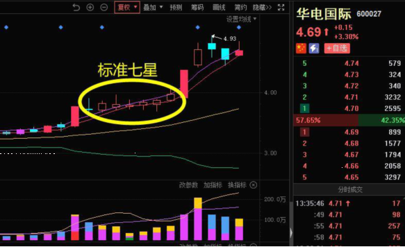 案例一:华电国际标准的首板七星战法,首板之后7个交易日保持整体横盘震荡,且个股处于趋势向上的过程中,配合公司并购重组并发行可转换债券的利好,成功走出七星战法。
