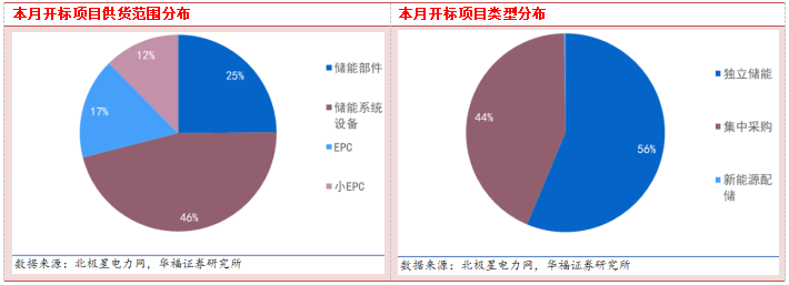 按项目类型划分,集中采购占据半壁江山。本月开标项目中,独立储能/新能源配储/集中采购项目个数分别为9/1/5个,容量占比分别为56%/0%/44%,本月新能源配储开标容量仅10MWh。储能采购呈现集中化、精细化的趋势,央企集采占据半壁江山,出现了电芯、PCS、BMS等部件单独采购的情况。