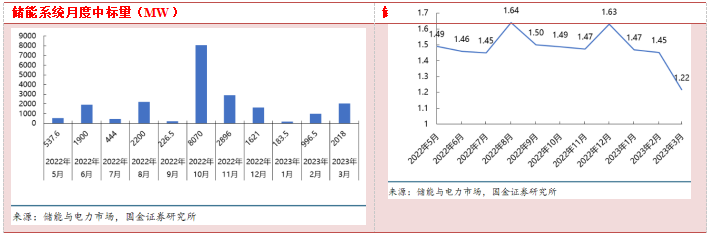 从中标价格来看,受益于上游原材料大幅下降,3月储能系统报价环比下降明显。2小时储能系统报价区间为1.17-1.25元/Wh,加权中标均价1.22元/Wh,较1月均价下降0.23元/Wh,较2月均价下降0.23元/Wh,环比下降16.16%;3小时储能系统报价为1.17元/Wh,最低中标价1.17元/Wh来自南都电源中标的豫能集团储能系统集采项目(标段二)。