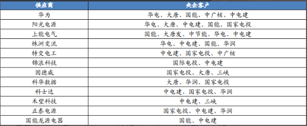 从2022年各企业的央企拿单实力来看,第一梯队的华为、阳光、上能、株洲变流最为突出,与央企客户绑定更为紧密。华为的主要央企客户有华电、大唐、国能、中广核、华润等;阳光主要央企客户为华电、大唐、中电建、国能、国家电投;上能主要央企客户有国能、大唐、中节能华电、中电建;株洲变流主要央企客户有华电、中电建、国能、华润。