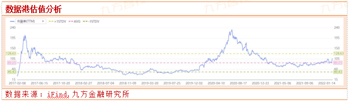 根据iFinD数据,当前数据港静态PE(按2021年盈利预期)为84倍左右,动态PE(按2022年盈利预期)为55.4倍左右,公司历史估值中枢为89倍左右,估值下限区间(均值-1个标准差)为50倍左右,公司2022年动态PE在公司估值下限区间附近,有一定安全边际。