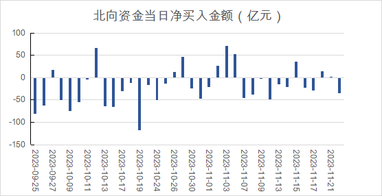 11月22日,北向资金再度出现了一定的净流出,陆股通整日净流出规模为35.39亿元。其中,沪股通整日净流出7.00亿元,深股通整日净流出28.38亿元。