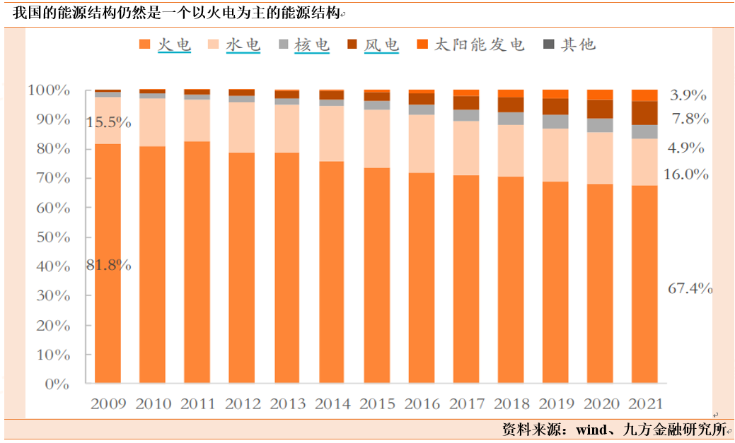 当前,中国两个统计口径下的碳排放量指标均显示,中国一半左右的碳排放来自发电供热部门,而其中,火电发电量占比仍具有绝对优势。因此,降低发电结构当中的火电占比,大力发展水核风光等相对清洁的可再生能源,是实现双碳目标的重要手段。