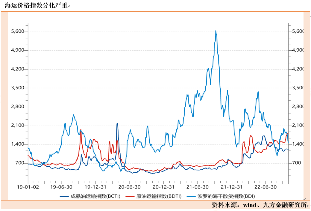 海运作为解决大宗商品供需错配的枢纽在未来仍然将发挥着不可或缺的重要作用。但是海运内部的分化更加严重,随着欧美经济趋于衰退,干散运输指数从高位回落,但是受地缘冲突影响,成品油和原油运输逐渐走出困境,与此同时,受益于中国制造业出口的特种运输今年保持了如火如荼的态势。