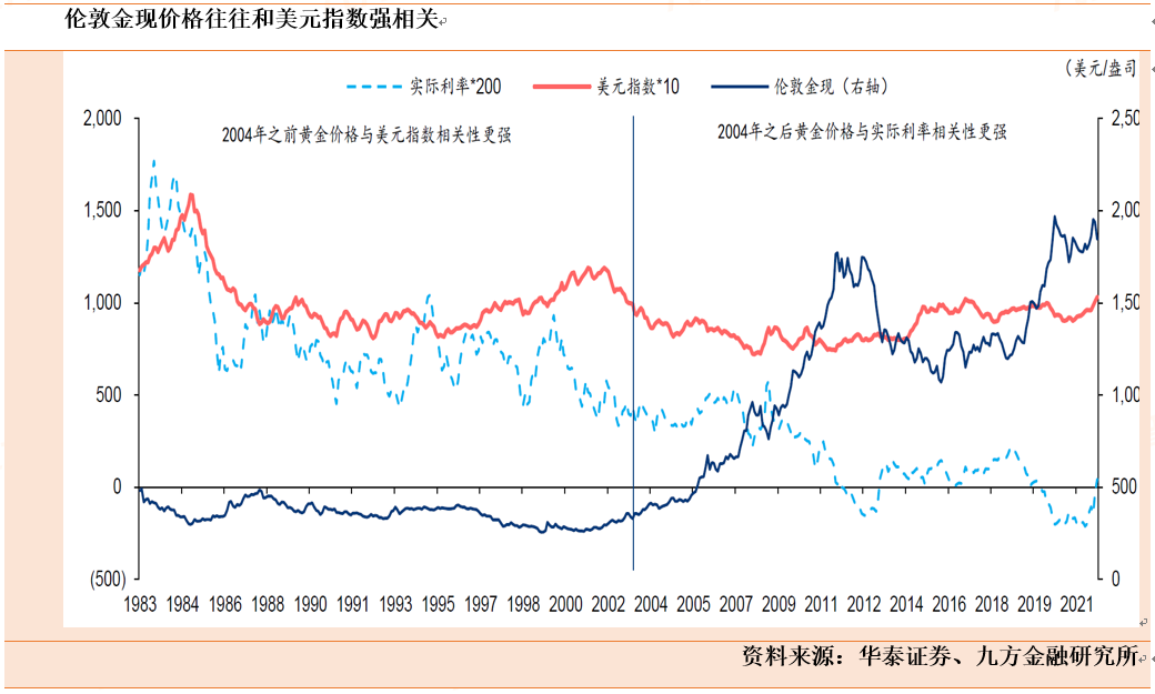 我们认为美联储加息将于2023年逐步趋缓,甚至开始降息,彼时,美元指数也将见顶,在加息尾声,黄金往往伴随着一轮上涨的行情。