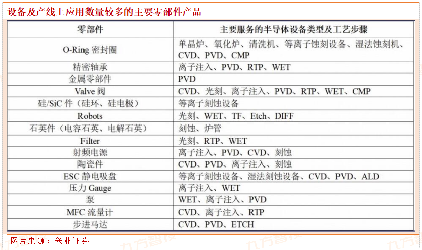 半导体设备精密零部件指的是半导体设备中所用到的上游精密零部件,是半导体设备的重要组成部分,具体包括各种Pump(泵)、Valve(阀门)、ORing(密封圈)、ESC(静电吸盘)、ShowerHead(气体喷淋头)等,同时晶圆制造厂商也会采购各种精密零部件以支撑产线正常持续生产或作为备件使用。
