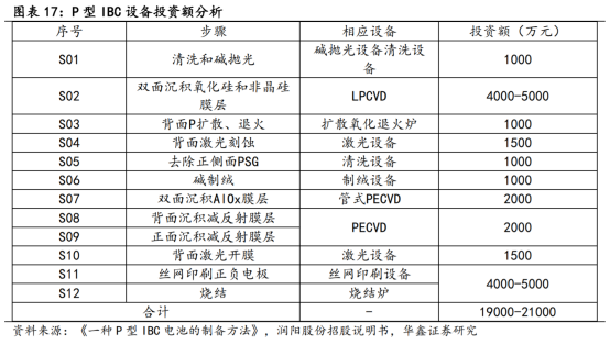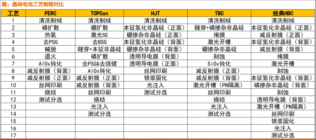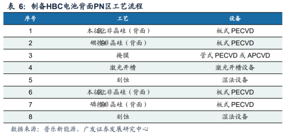 1)制备背面P区(掺硼非晶硅)和N区(掺磷非晶硅):以Kaneka方案为例,涉及下表工序4-5-6-7-8-9-10-11,需要板式PECVD、管式PECVD或APCVD、激光开槽设备、湿法设备等。