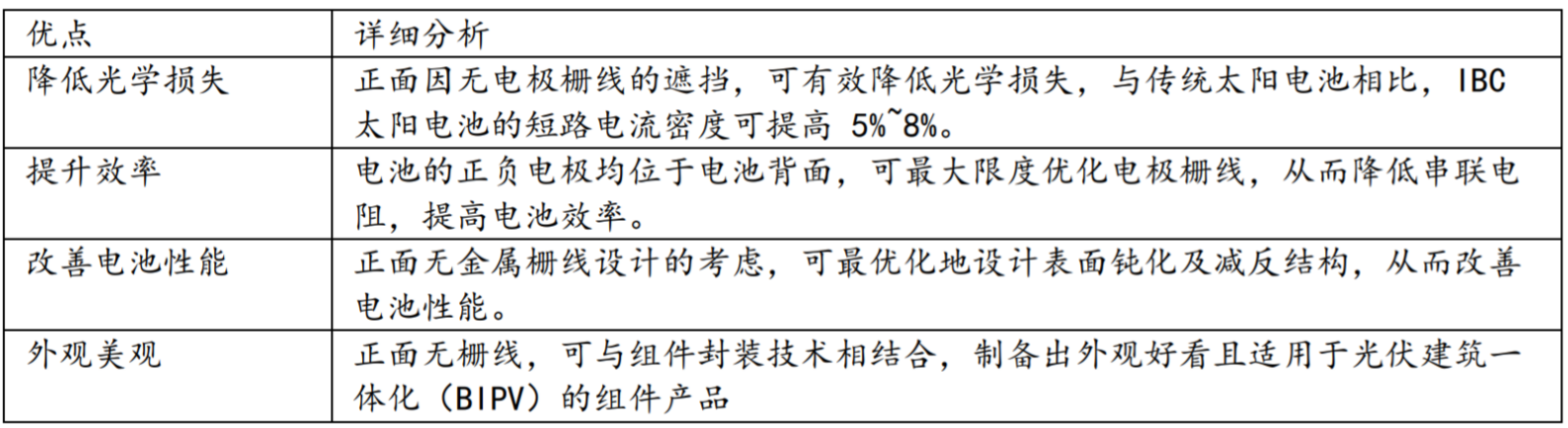1) 正面因无电极栅线的遮挡,可有效降低光学损失,与传统太阳电池相比,IBC 太阳电池的短路电流密度可提高 5%~8%;