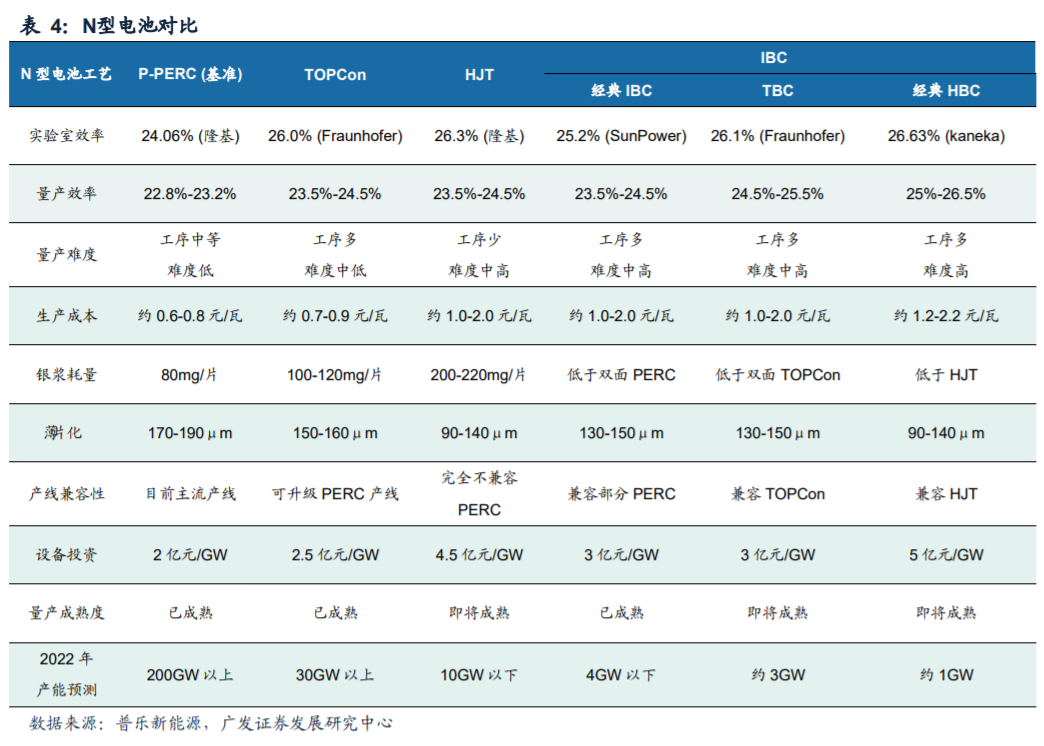 根据普乐新能源的披露,IBC电池技术的生产成本和产线投入仍然不占优势,非硅成本的差异主要来源于良率、银浆成本和折旧成本,成熟的PERC电池在现阶段还具有较为明显的性价比。随着TOPCon技术以及HJT技术的不断进步和成熟,与其相结合的TBC、HBC电池有望受益。